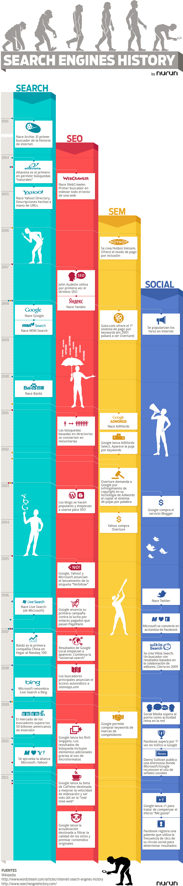 Desde Nurun, la agencia interactiva en la que trabajo, hemos sucumbido a la moda y hemos creado una infografía de la historia del marketing en buscadores. Es una manera de analizar la historia de un sector todavía muy dinámico, pero que ya tiene unos años y además trata de establecer las áreas que lo componen y en cierta manera su interrelación.